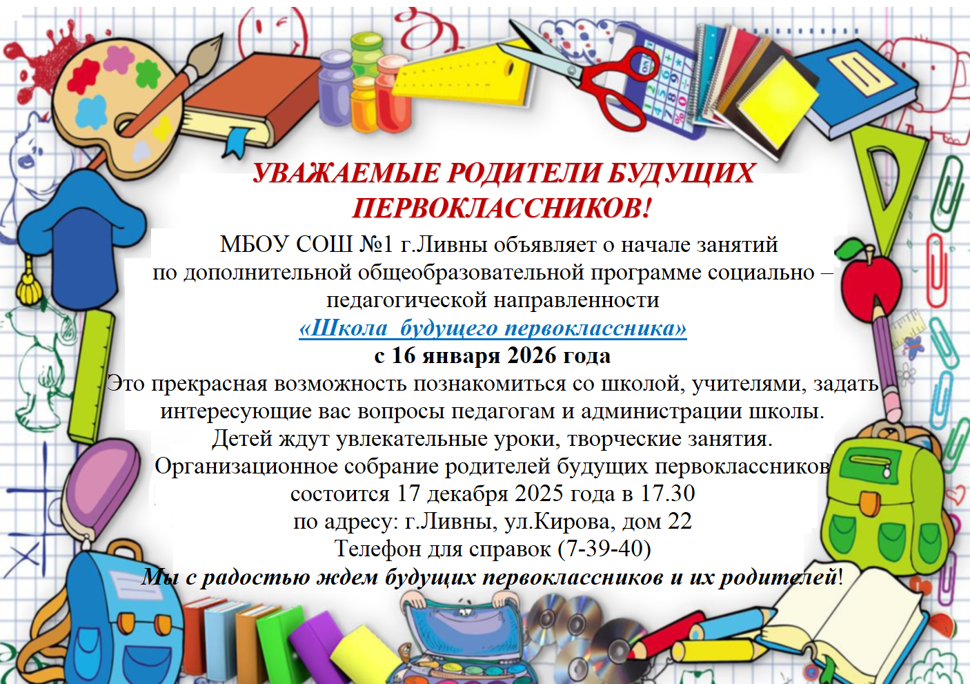 Всю интересующую вас информацию вы можете найти на официальном сайте школы (http://livny-sosh1.obr57.ru в разделе «Сведения об образовательной организации»/ Платные образовательные услуги). Подать заявления и заключить договор на оказание платной образовательной услуги можно с 8.00 до 16.00 час с 10.01.2026 года.
